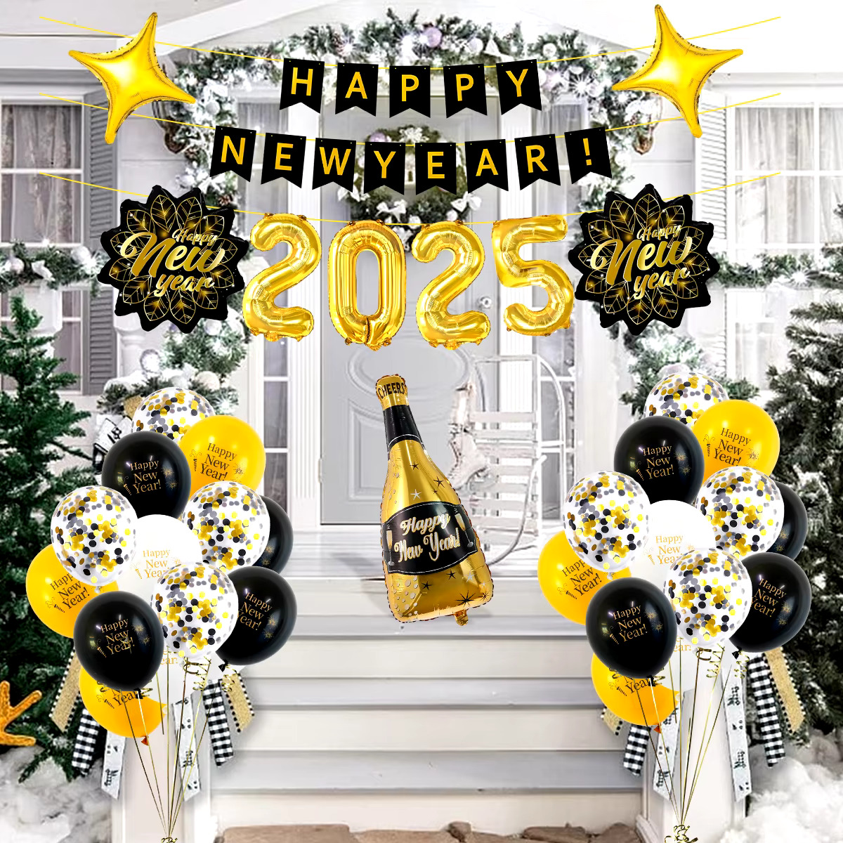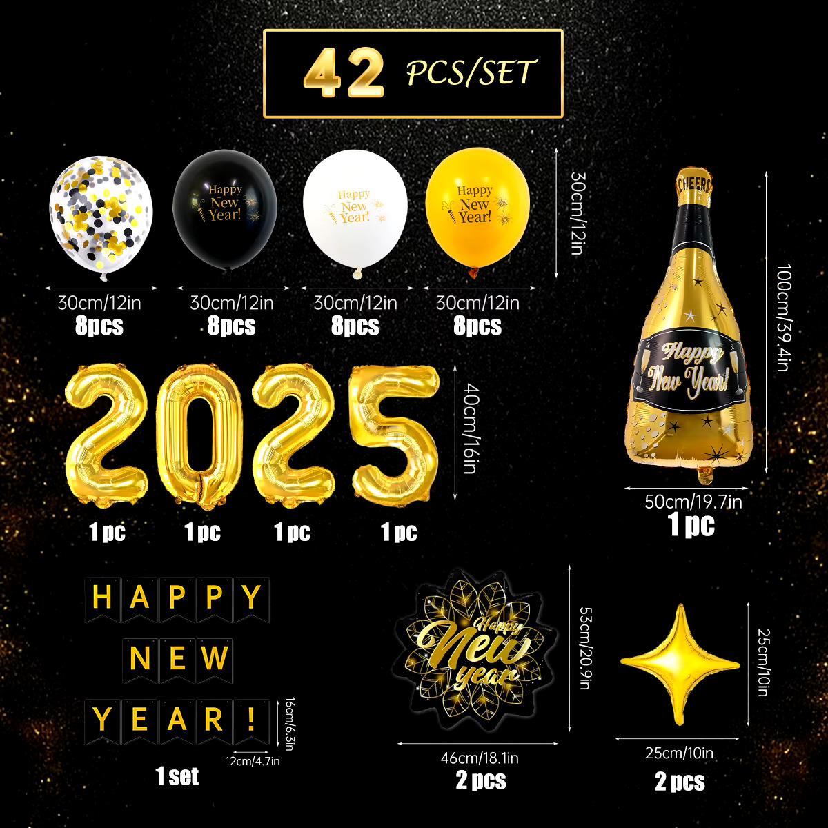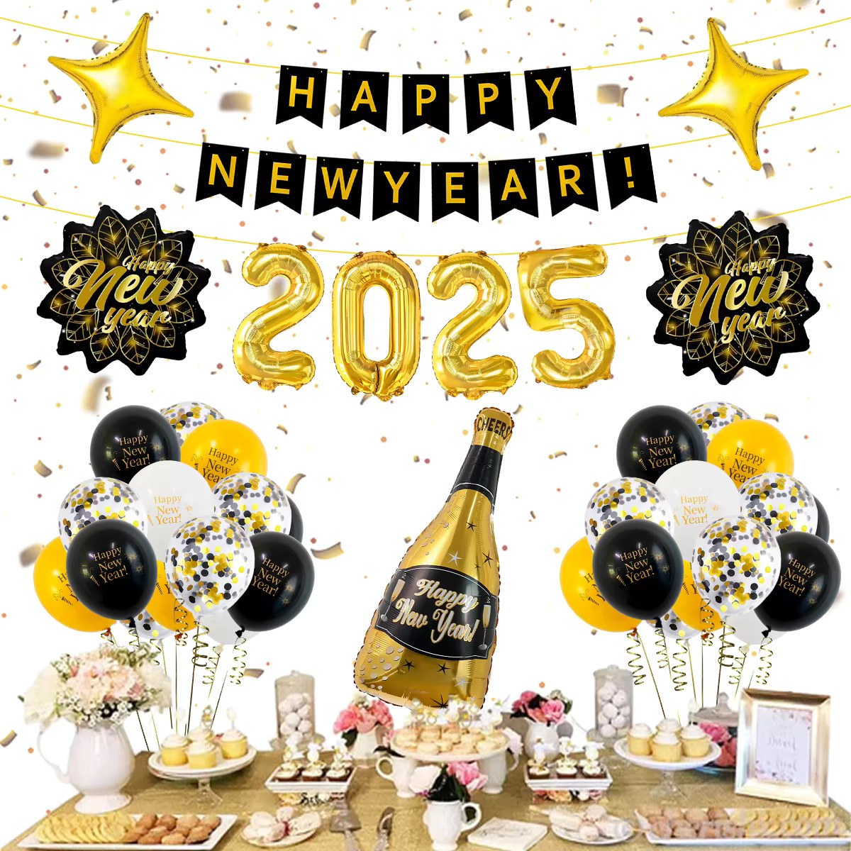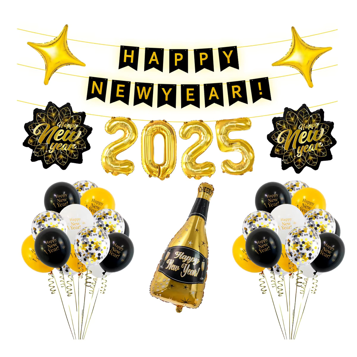 2025 balloon new year balloon set, happy new year banner, wine glass, new year leaf balloons for new year party decoration